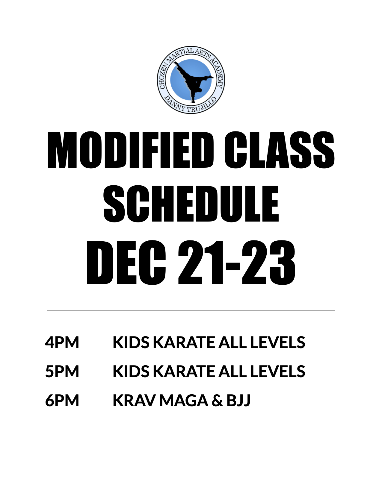 As we wind down to celebrate the holidays, the dojo is adopting a modified schedule for Dec 21-23. We'll be back on the mat with our regular schedule on Tuesday January 3rd!